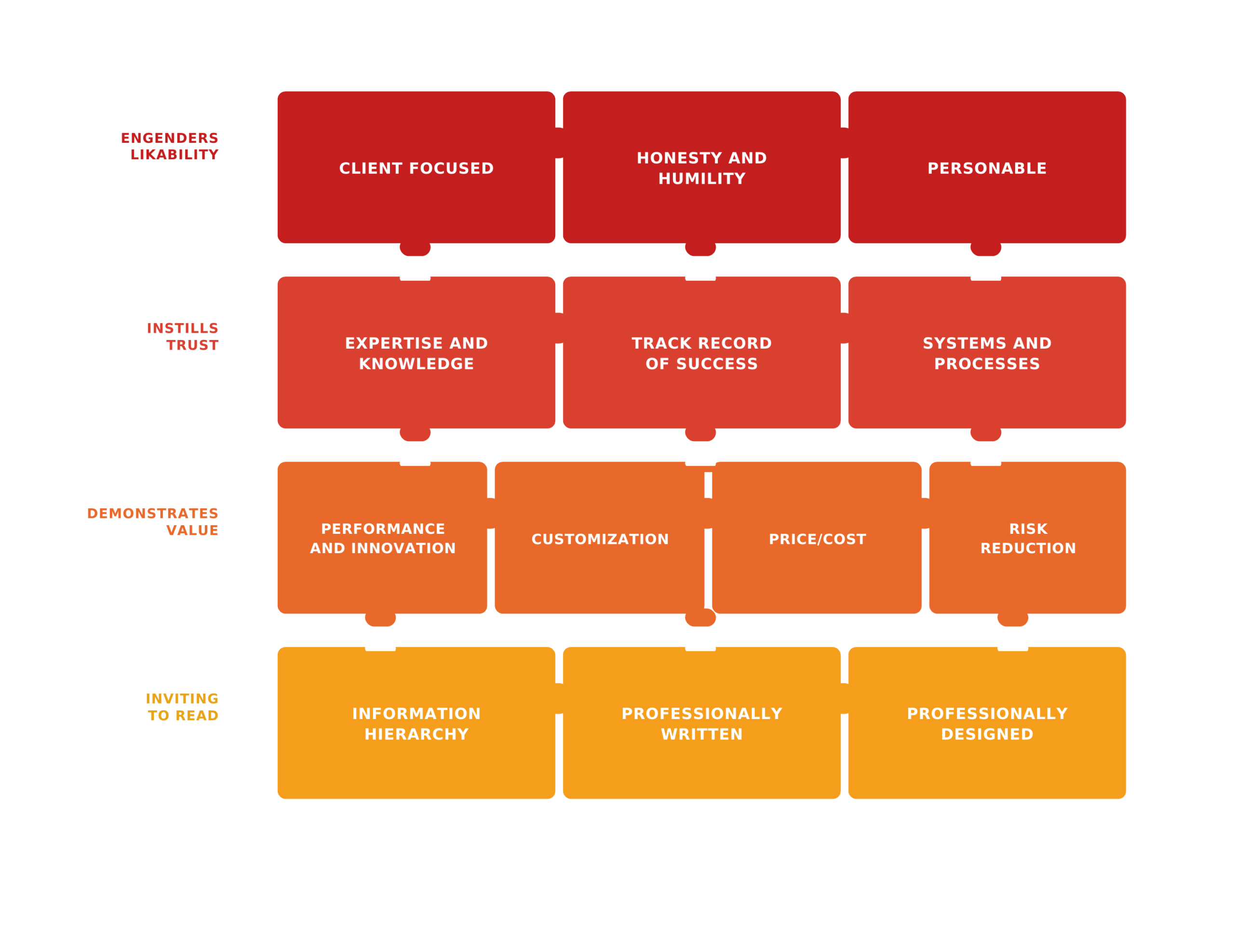 We run your existing content through The Proposal Lab's Value-Trust-Like (VTL) Framework to develop a detailed questionnaire specific to your firm. Your responses give us the raw material we need to articulate what makes your organization genuinely different - not in generic terms, but in the specific, evidence-based language that persuades evaluators.