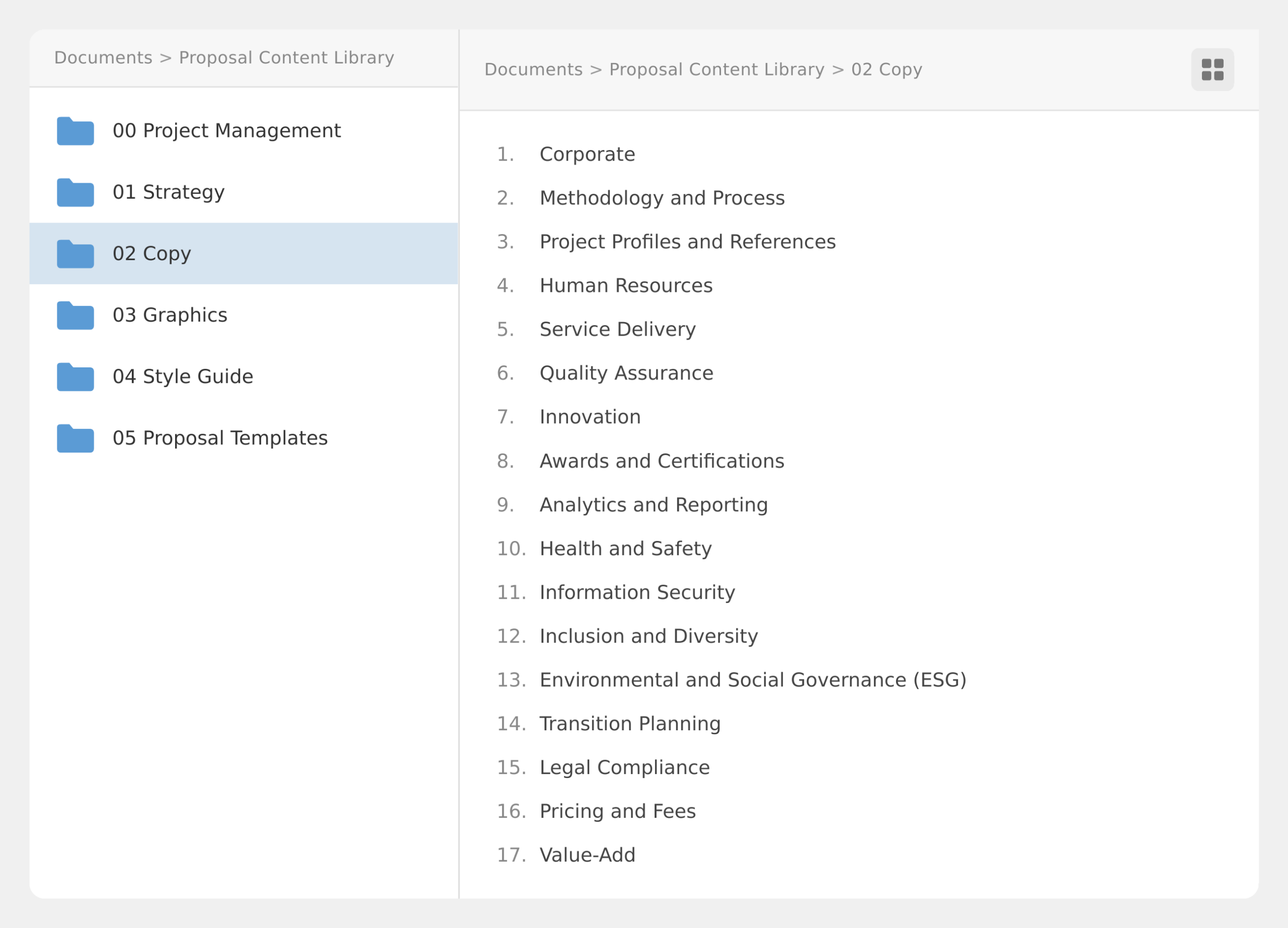 Our goal for every Proposal Content Library is to address approximately 80% of a client's content requirements for future submissions, giving your team a strong, strategically written starting point for every pursuit while leaving room to tailor for each specific opportunity.